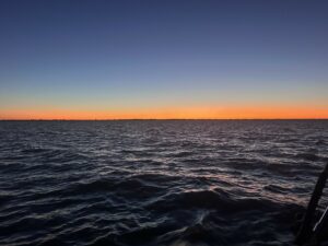 Wir sind heute frueh los, allerdings spaeter als gedacht dank einer Weckerfehlmanipulation. Ist aber weiter nicht schlimm, da wir so schnell unterwegs sind, dass wir voraussichtlich wirklich kein Timing-Problem haben. Wir haben idealen Wind und anfaenglich total ruhiges Meer, jetzt ist es mit 20-25 Knoten Wind natuerlich etwas aufgewuehlt, aber noch gut ertraeglich. Und so rauschen wir mit z.Zt. ueber 7 Knoten ueber Grund dahin. Verkehr hat es nicht, nur unsere Buchtnachbarn von gestern und heute sind hinter uns. Jetzt, nach einem Radio-Tatort und zwei Filmen ist Bettruhe angesagt. Es geht gegen Mitternacht und der Wind dreht wieder zurueck, wie prognostiziert. Mal sehen, ob er auch so stark abnimmt, wie angekuendigt. Waere irgendwie schade um den Geschwindigkeitsrausch.