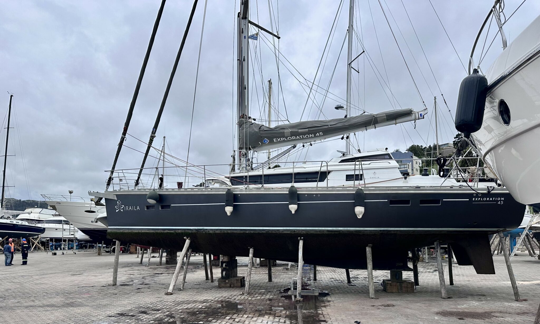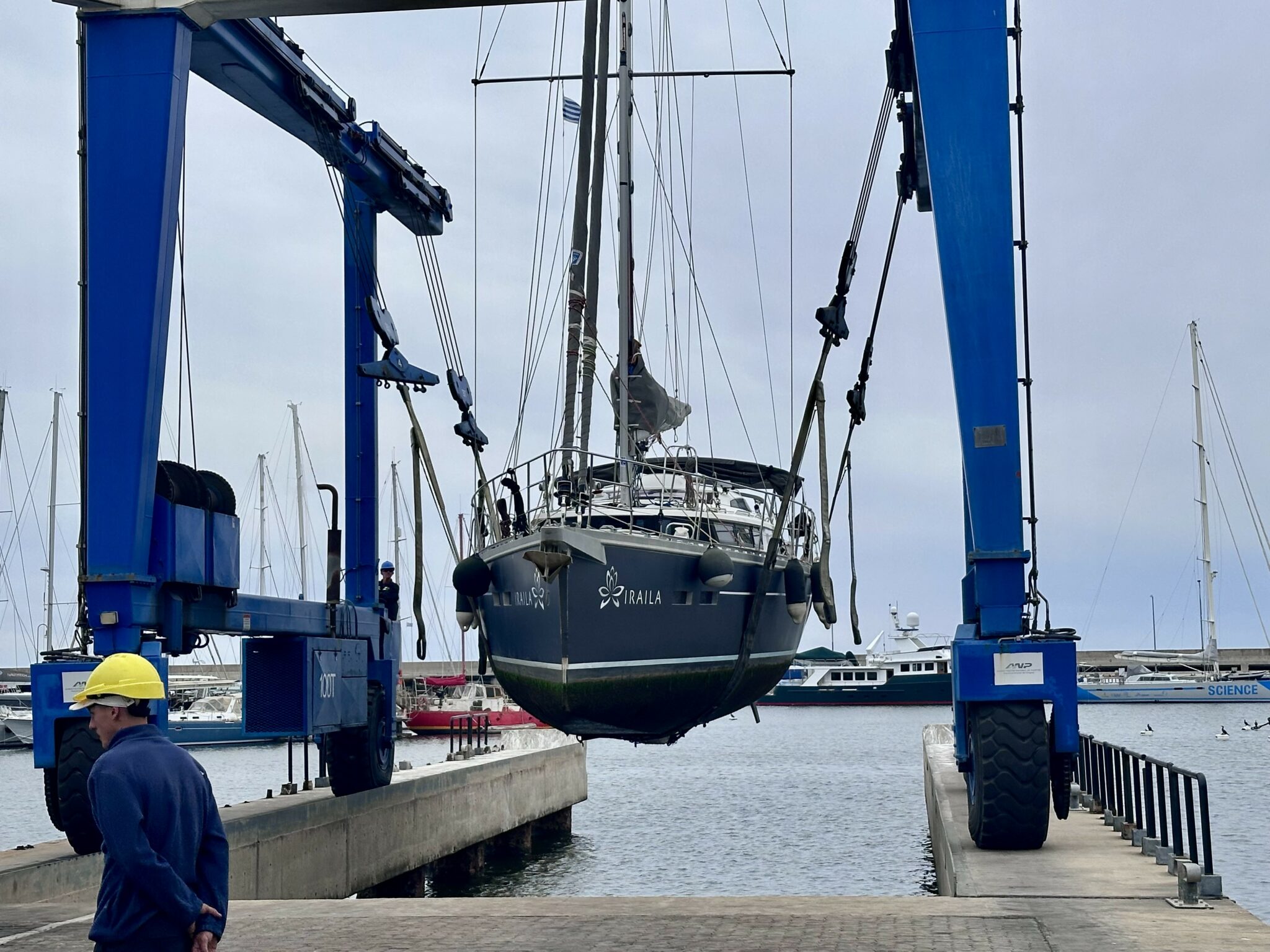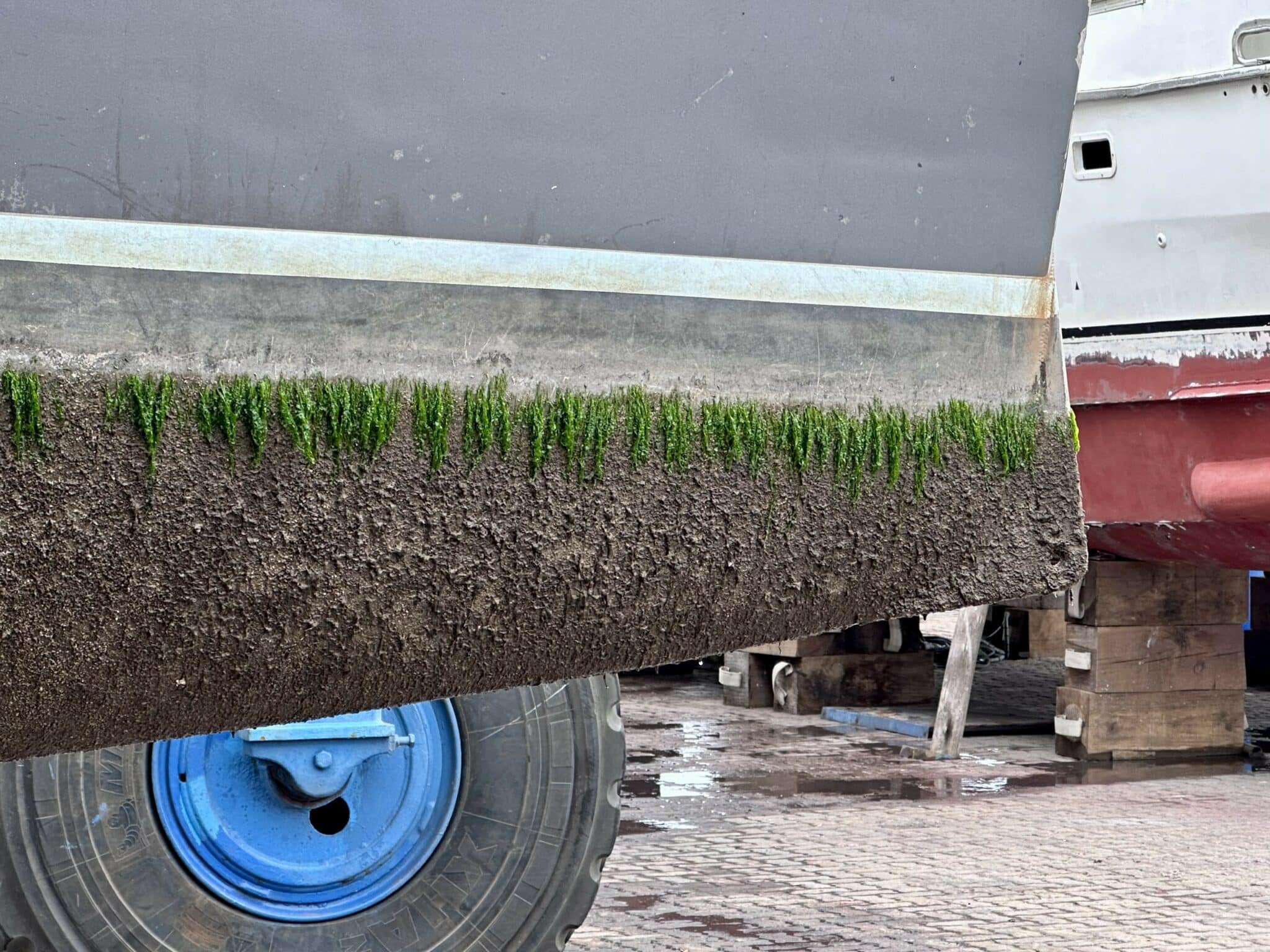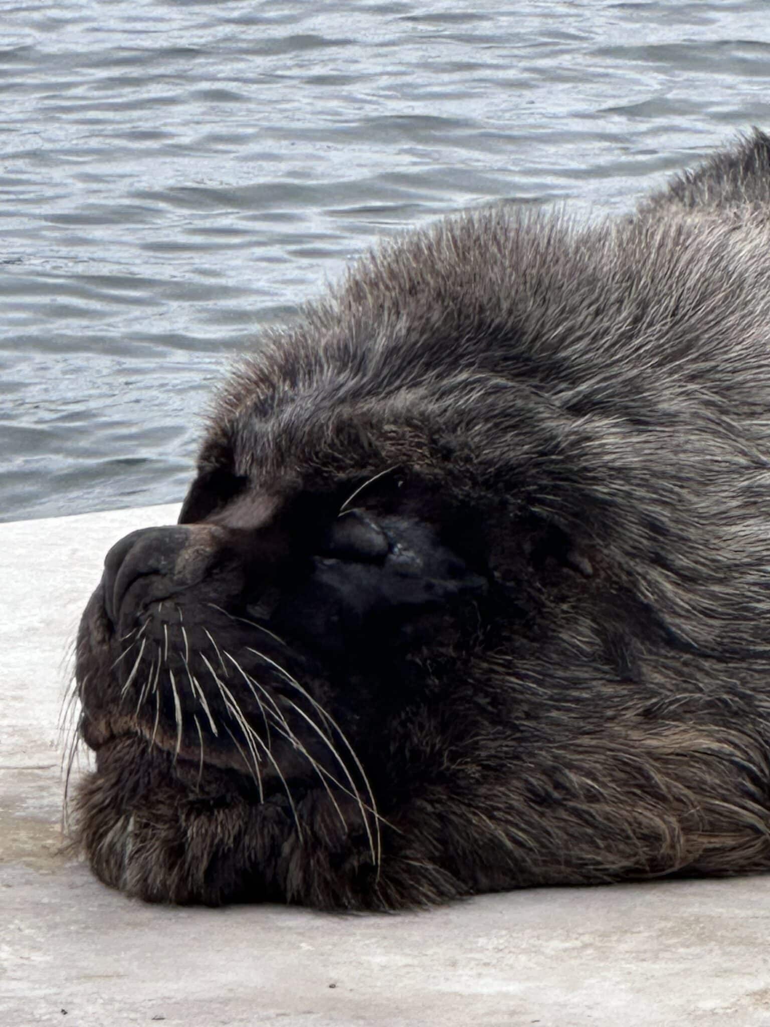 Nach drei Wartewochen, die wir gut gemeistert haben, ging die Iraila heute auch auf Landgang. Das Unterwasserschiff sieht nicht gerade appetitlich aus. Das liegt wohl zur Hauptsache am Hafenwasser hier, die Leinen, die an die Boje führten, sahen auch schlimm aus. Nach dem Abwasch offenbarte sich, dass der Taucher in Rio ganze Arbeit geleistet hatte: das ganze Antifouling ist weg. Es bräuchte aber noch eine Restschicht, damit das neue gut daran haftet. So muss nun eine Schicht Primer aufgetragen werden, bevor der tatsächliche Job erledigt werden kann. Nun denn, wir nehmen das etwa so gelassen, wie der Seelöwenbulle, der am Werftgelände liegt.