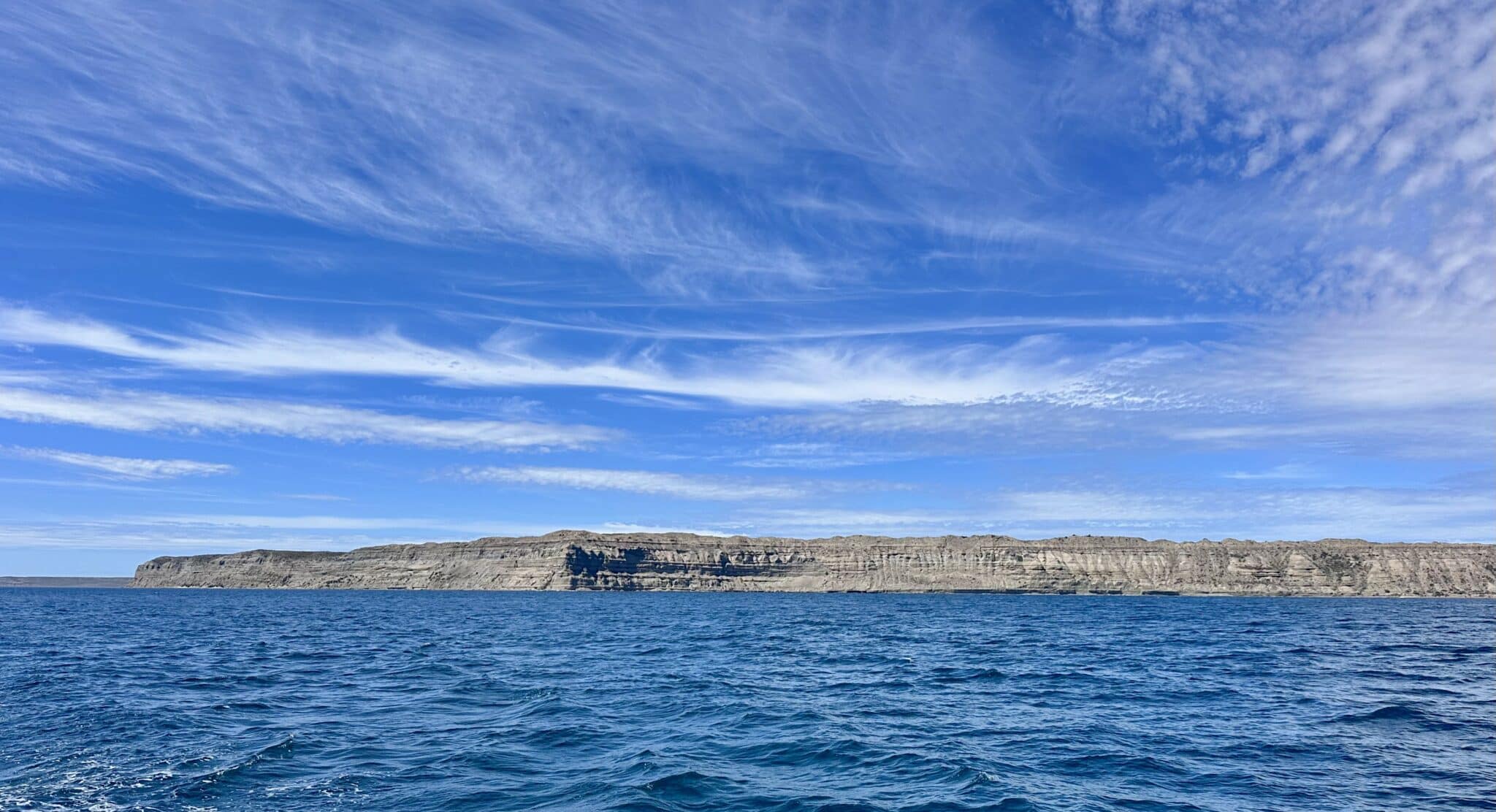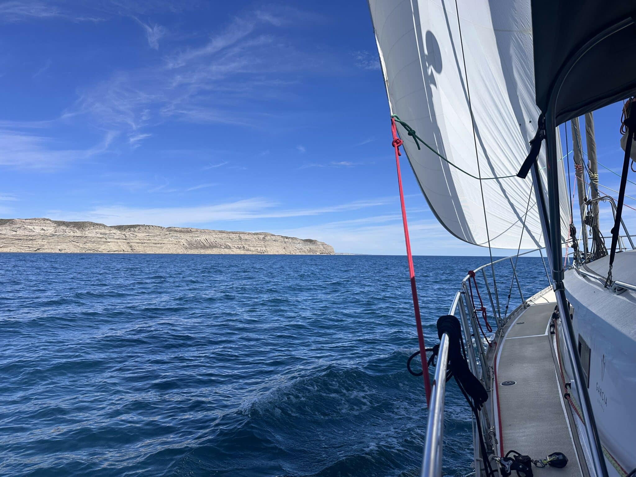 Mit halbem Wind segeln wir nun Puerto Madryn entgegen, den Blick umherschweifen lassend, in der Hoffnung, einen Wal zu erblicken. Die Bucht ist von Mai bis Dezember ein beliebtes Walaufenthaltsgebiet, um den herum es anscheinend viel Tourismusaktivitäten von Puerto Madryn aus gibt. Dank des klaren Wassers (ja, seit Langem ist das Meer endlich wieder blau und der Filter des Wassermachers bleibt bei 100%!) soll es auch ein Tauchzentrum sein. Bei 14 Grad denken wir aber nicht mehr über freiwilligen Wasserkontakt nach.