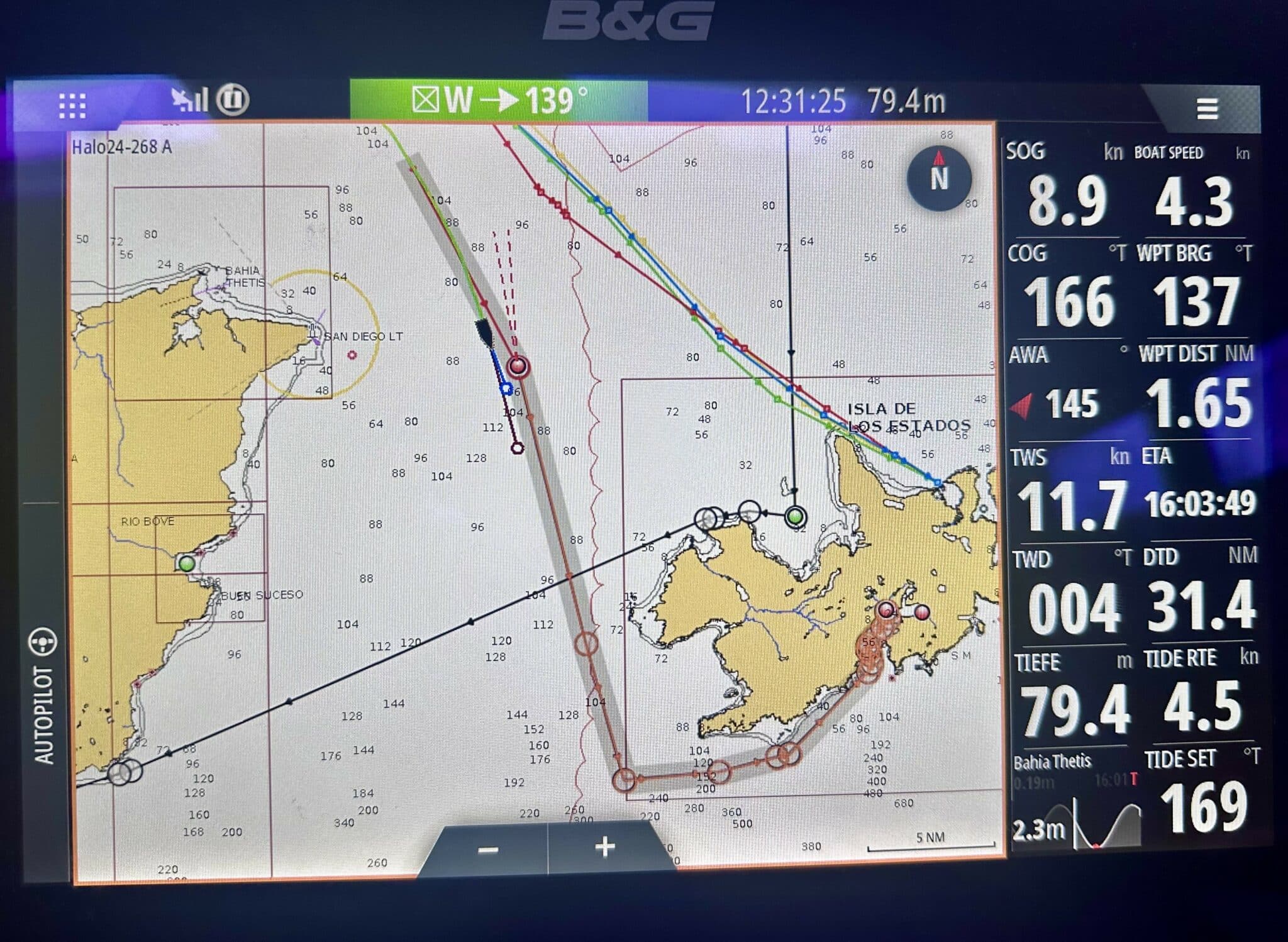 Trotz oder wegen des nächtlichen Gebummeles scheinen wir ein gutes Timing für die Passage der Le Maire-Strasse zu haben. Und so ist auch entschieden, in wessen Wunschbucht wir segeln: die Meitli-Bucht, sprich die Bucht der Skipperin. Sie, die Bucht, liegt im Süden der Insel. Im Norden läge die Bahia Hoppner, die anscheinend schönste/beste Bucht. Aber vorausschauend ist es günstiger, Le Maire hinter uns zu haben, da müssen wir weniger ‚zirkeln‘ beim Rüberfahren zum Beagle-Kanal.