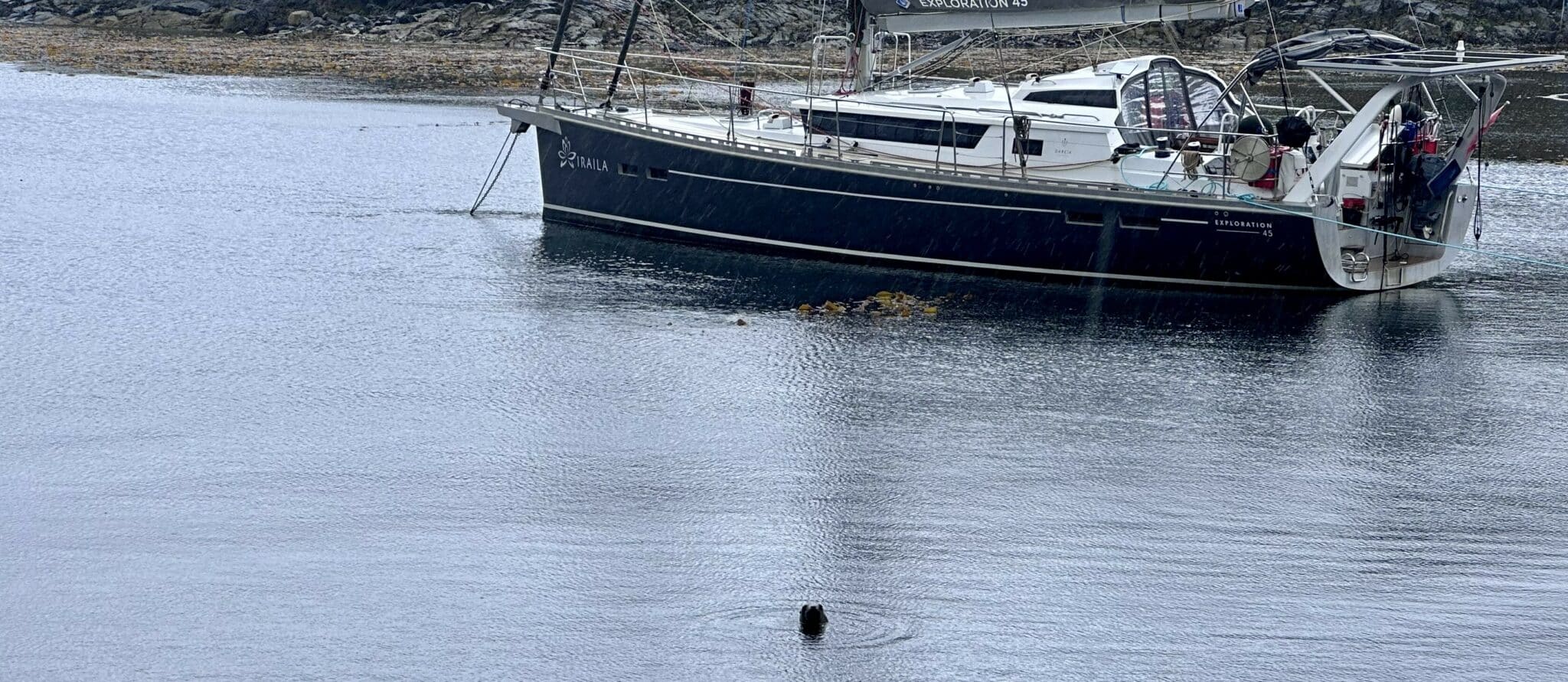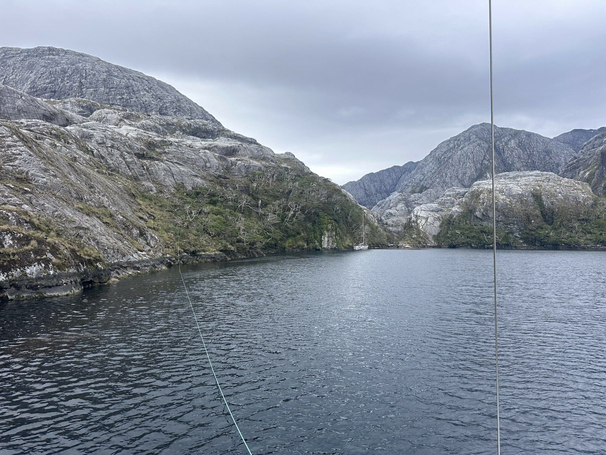 Das Wetter hat sich wieder normalisiert, d.h. es ist wieder feuchter und trüber geworden. Das Festmachen ist nicht so königlich wie unser Kreuzen; die eine Leine reisst erst ein Bäumchen aus, dann einen Felsnagel. Erst der dritte Versuch an einem weit entfernten grösseren Baum verspricht Sicherheit. Mühsam. Von den beiden frühen Einsätzen der letzten Tage sind wir ein wenig gezeichnet. Wir waren wohl auch schon mal jünger…