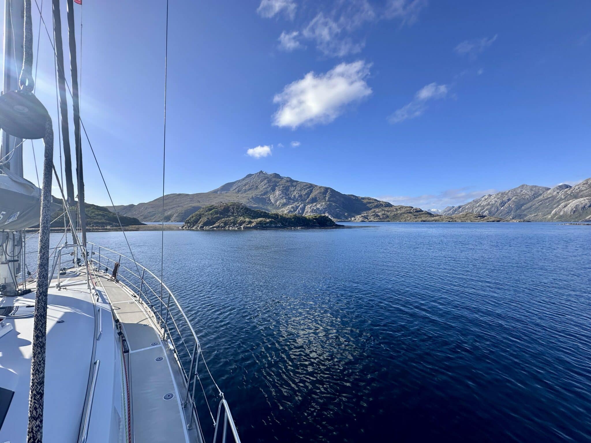 Von Caleta Lagunas ging es erst am Nachmittag los und nicht sehr weit, aber wir hatten uns damit eine gute Ausgangslage für den nächsten Tag geschaffen. Es ging schon um 4 Uhr früh weiter, um den Wind eben noch zu nutzen. Das klappte auch sehr gut und bescherte uns einen herrlichen Segeltag. In den hunderte Meter tiefen Gewässern zwischen den Inseln sahen wir lange Zeit Blase von Walen und ihre Rücken, einmal schraubte sich einer empor, um dann wieder ins Wasser zu klatschen. Herrlich. Die Sonne bestrahlte endlich wieder einmal die schroffer werdende Landschaft und sorgte für vergleichsweise angenehme Temperaturen.