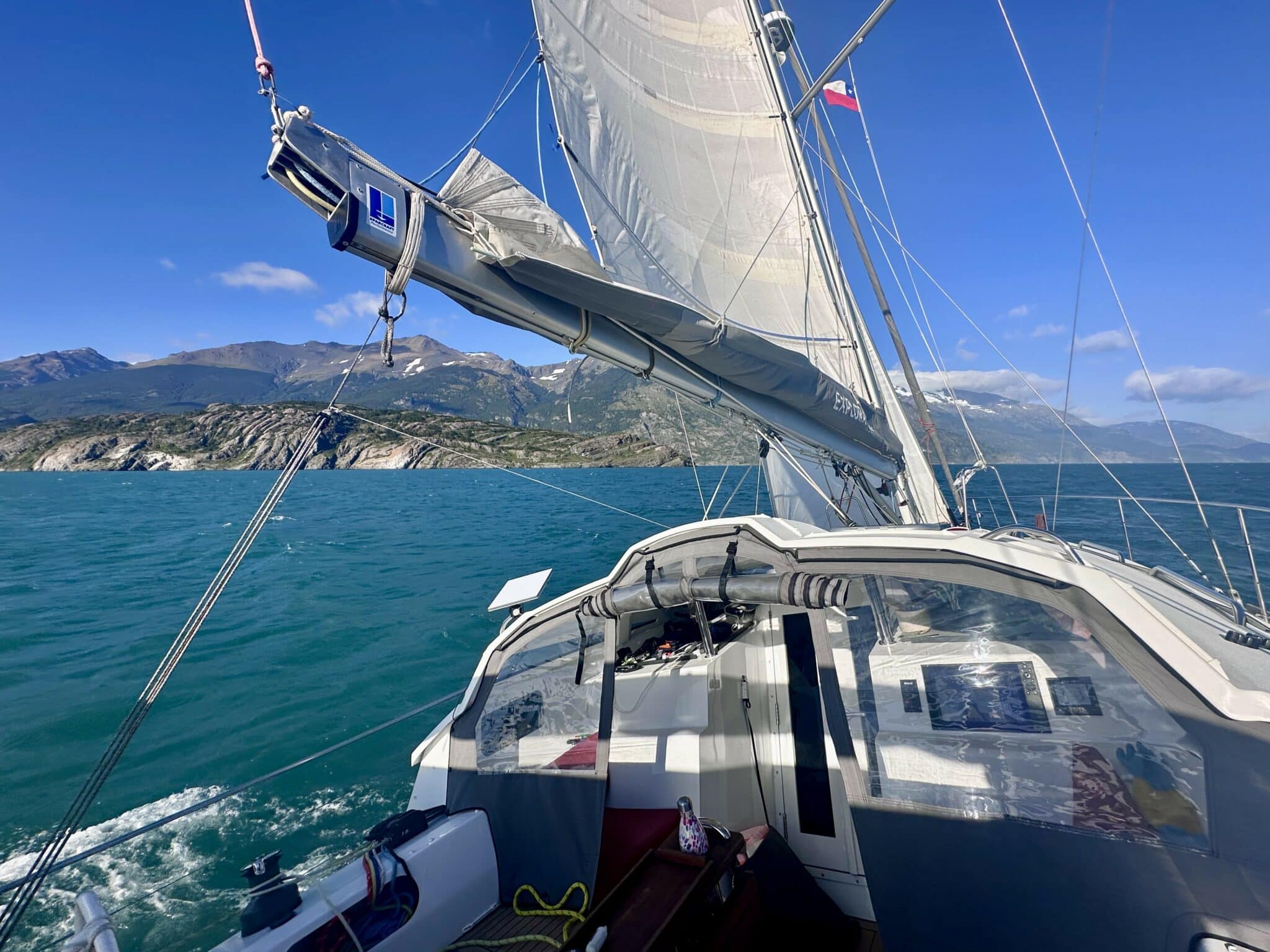 Am frühen Nachmittag bei Windstille nahmen wir den Rückweg in Angriff und rechneten eigentlich mit einigen Motorstunden. Kaum im Fjord setzte aber wieder Wind von achtern ein und schob uns stundenlang voran bis zurück nach Puerto Natales.