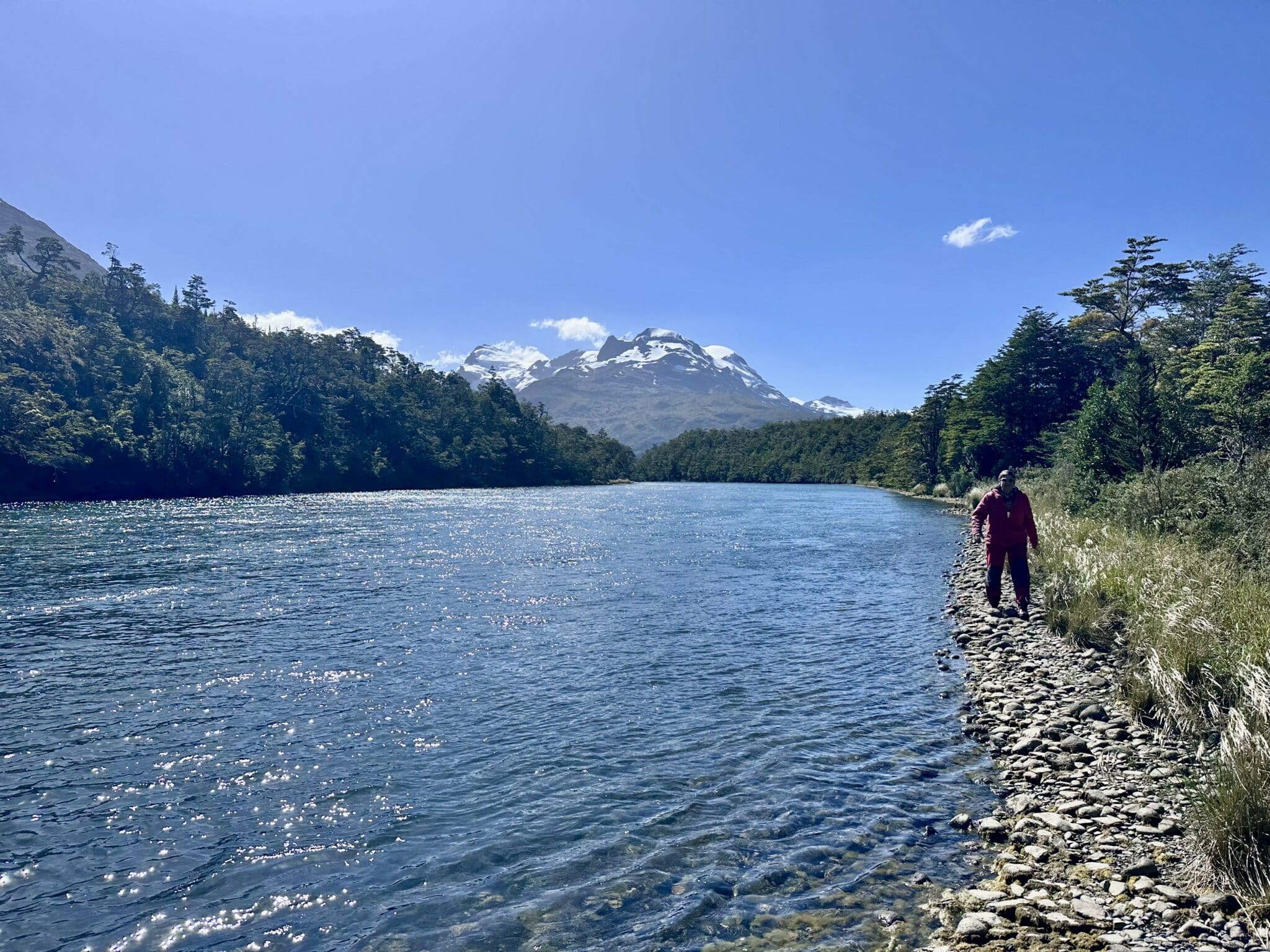 Wir gaben schliesslich auf. Auf den Weg raus mit dem Dinghy stach uns aber doch der Hafer und wir versuchten nochmals den Wasserweg hoch. Diesmal klappte das dank permanenter Grundbeobachtung durch die Co-Skipperin, so dass wir schliesslich den Lago Azul erreichten. Dort baute der stärker wehende Wind bereits eine – für das Dinghy – ordentliche Welle auf, so dass unser Wunsch, um die nächste Ecke blickend eine Blick auf einen Gletscher erheischen zu können, nass erkauft werden musste. Und nur um festzustellen, dass es da gar nichts zu sehen gab. Nun denn, schön und abenteuerlich war es trotzdem. Auf dem Rückweg konnten wir uns immerhin den Fluss hinunter treiben lassen.
